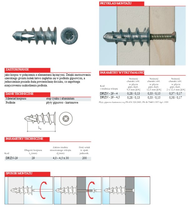 Kołek metalowy "DRIVA" stosowany jako korpus w połączeniu z elementami łączącymi. Dzięki zastosowaniu szerokiego gwintu kołek łatwo zagłębia się w podłożu gipsowym, a jednocześnie posiada dużą powierzchnię docisku, co zapobiega miejscowemu uszkodzeniu podłoża.